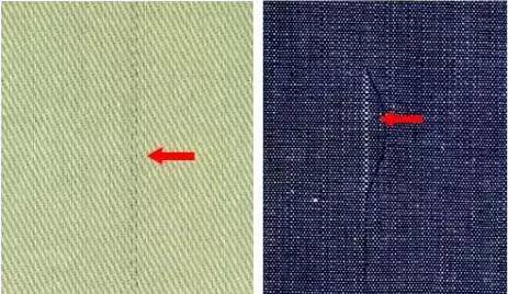 緯向疵點:布面上由緯紗形成或沿緯紗方向形成的疵點。如缺緯、斷緯、粗緯、松緯、雙緯、厚段、薄段、錯緯、換襠、稀弄等。